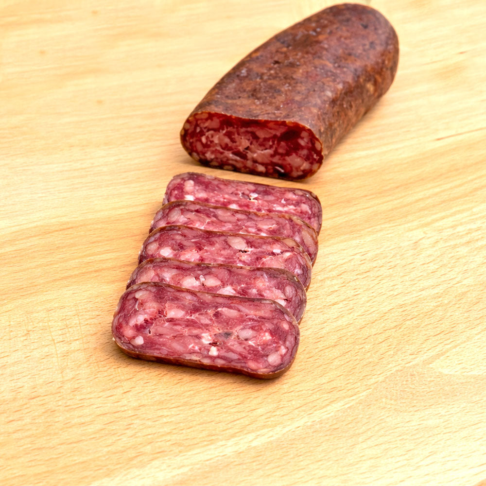 Свинско Месо 60% (ЕО), говеждо (телешко) месо (ЕО), сланина, сол, черен пипер, захар, калиев нитрат, ядлива обвивка